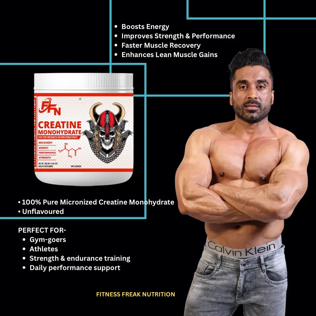 + Free ShippingFITNESS FREAK NUTRITION 100% Pure Micronised Creatine Monohydrate is a clean, ultra-pure supplement designed to boost strength, power, and lean muscle growth. Its micronised form ensures fast absorption and easy mixing, helping fuel intense workouts by enhancing ATP production. Vegan-friendly and free from GMOs, gluten, and artificial fillers, it supports improved performance, endurance, and quicker muscle recovery making it a perfect daily essential for serious training and results.