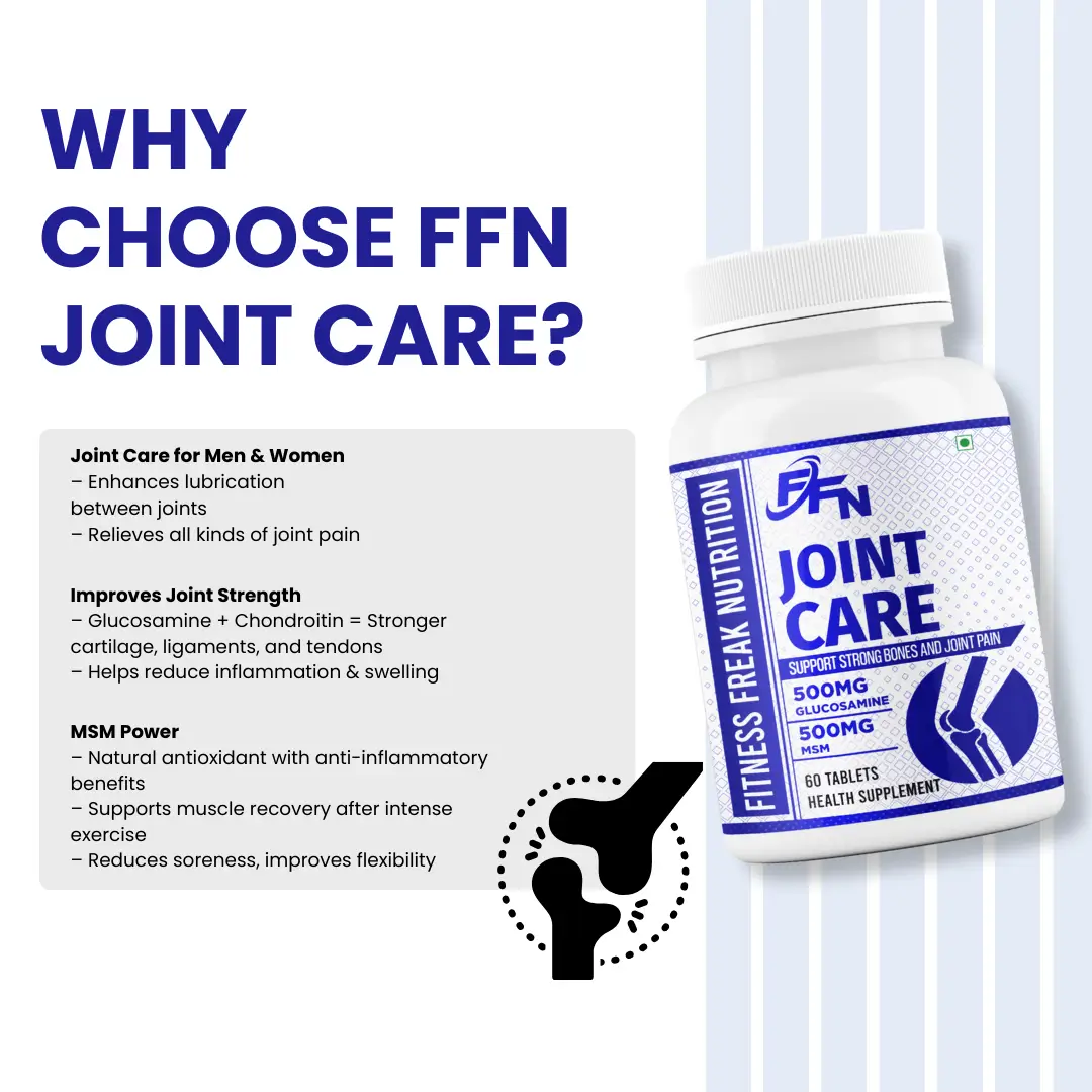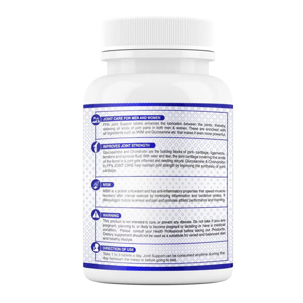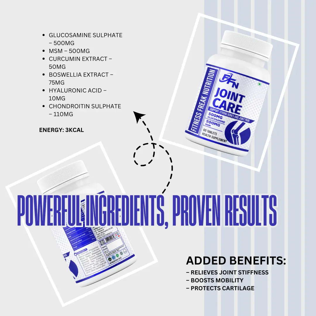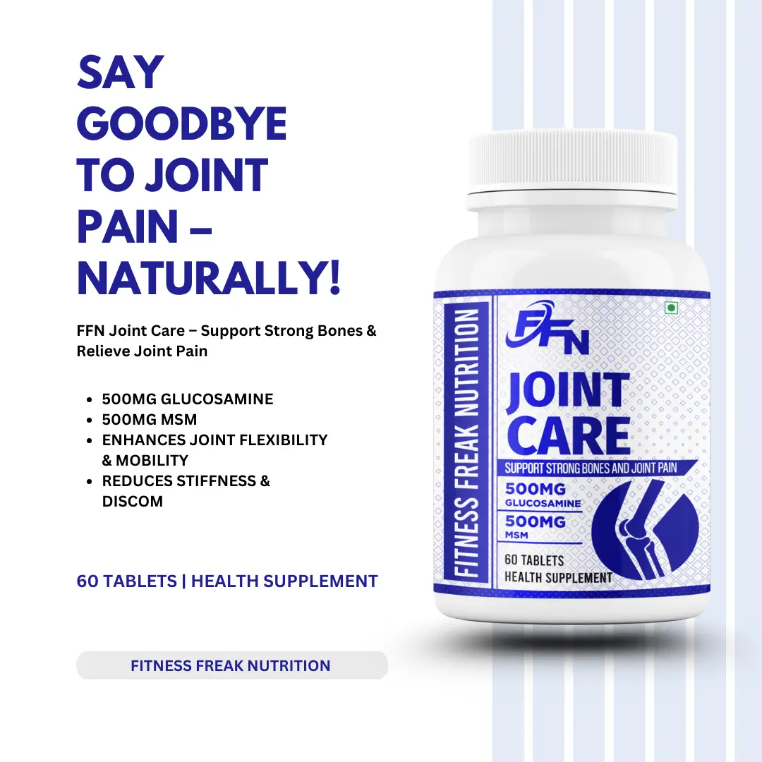 Introducing Joint Care Support a powerful blend of 500mg Glucosamine and 500mg MSM designed to maintain joint flexibility, improve mobility, and strengthen bones. Perfect for athletes, fitness enthusiasts, and anyone seeking long-term joint care, this formula helps you stay active and pain-free